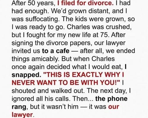 We signed the papers in the morning—fifty years dissolved in a few strokes of a pen—and our lawyer suggested coffee to mark the end of something we’d once believed would never end. It was civil, almost gentle, until the menus arrived and Charles, out of pure habit, told the waiter what I’d have.