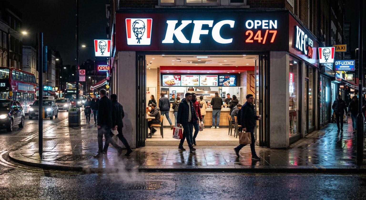 For decades, businesses have relied on signage, lights, and marketing slogans to communicate operating hours. Neon “OPEN” signs glow in windows, printed schedules hang on doors, and websites promise late-night service. Yet these signals still rely on customers noticing and trusting them. KFC’s approach flips this logic entirely. Instead of telling people they are open, the brand makes it visually impossible to miss. When passersby see a restaurant entrance with no doors at all, the message becomes instantly clear: this place never closes.